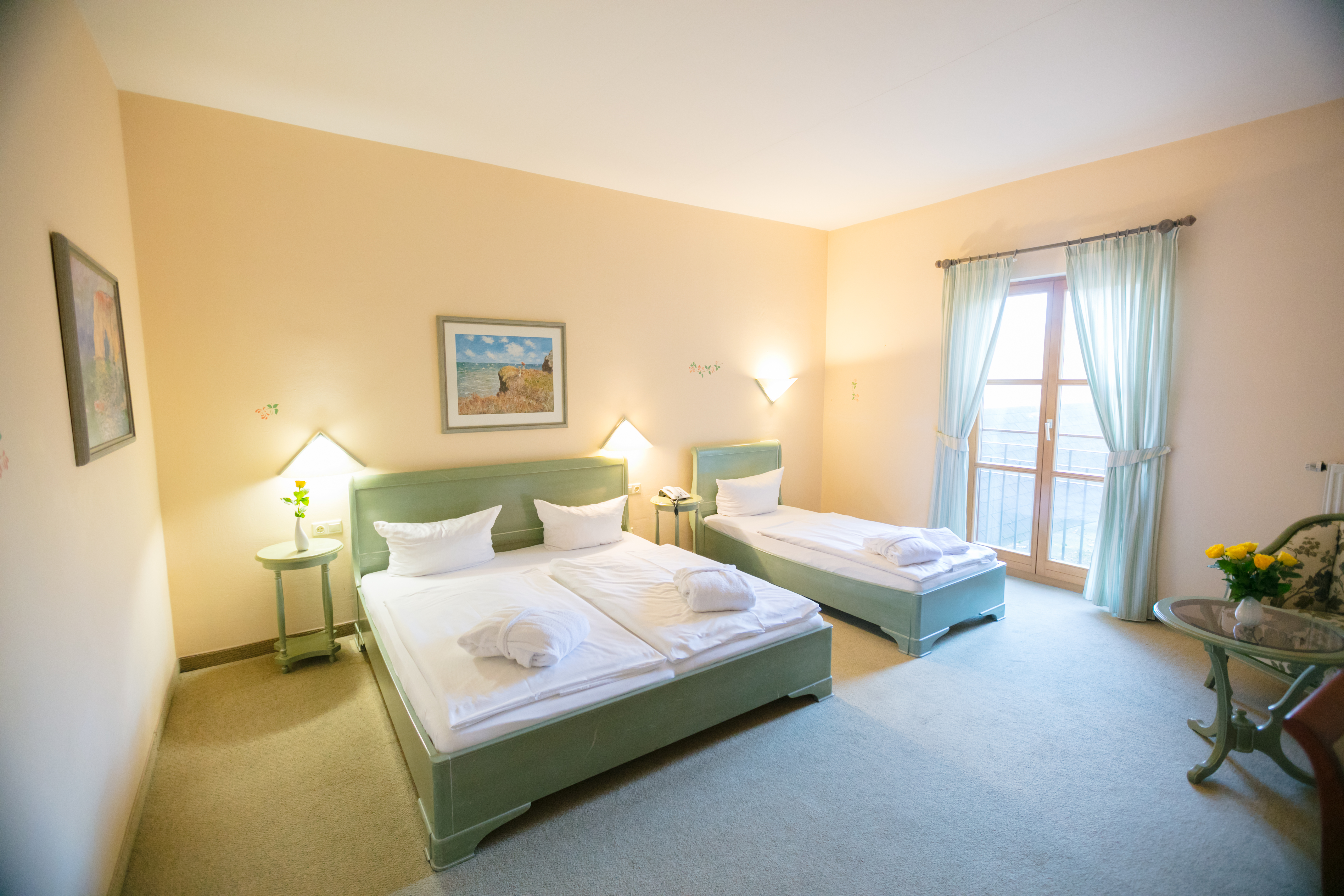 Das 28 m² große Dreibettzimmer Standard im HP ist mit und einer zusätzlichen Sitzecke ausgestattet.